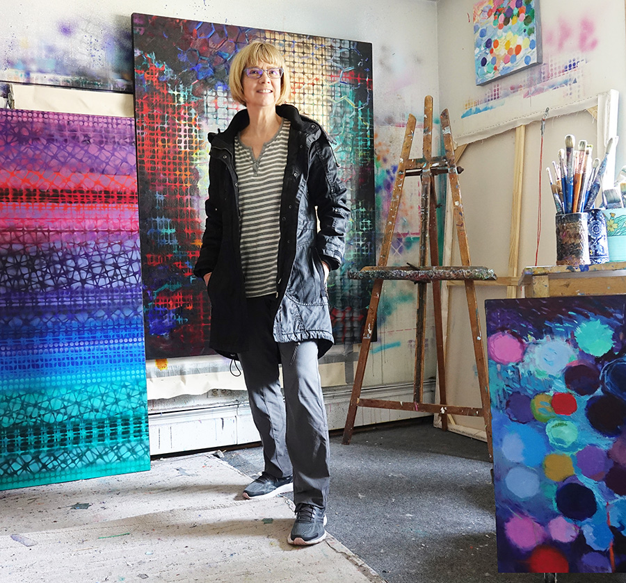 Since 2002 I have worked in my home studio in Charleswood, Calgary. Over time I evolved from oil to acrylic painting. My latest series, "The Geometry of Light" is a departure from landscape work, favouring memories of visual incidents, feelings, and associations. It is not only the forms in nature that inspire me but the light and wind, the heat of summer and the freezing cold. The focus of attention varies in the way one colour is affecting another or on the brushstrokes that define the space. I find my way with each rectangle and colour as they move toward the edges of the canvas implying that the painting continues beyond the canvas’s physical square. A deeper resonance is the allusion to inner and outer space, to images and patterns in batik, weaving, natural forms seen under a microscope, tight patterns reminiscent of fractals, and images derived from biology and astronomy. My view of nature is simultaneously real and imagined which results in unlimited possibilities for the collaboration between myself and the viewer in assigning meaning to the painting. All that is required of the viewer is to spend time looking deeply.